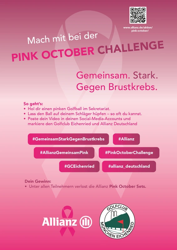 Im Oktober hält der Golfclub pinkfarbene Bälle der Allianz bereit, die im Sekretariat ausgeliehen und für die sogenannte "Keepy-Uppy Challenge" genutzt werden können. Dabei gilt es, den Ball so lange wie möglich in der Luft zu halten – Symbol für „am Ball bleiben“ und das in einem Video mit dem Smartphone festzuhalten. Botschafter und Unterstützer ist Golf-Pro Max Kieffer, der am Ende des Monats unter allen Teilnehmenden ein Pink October-Set verlost.