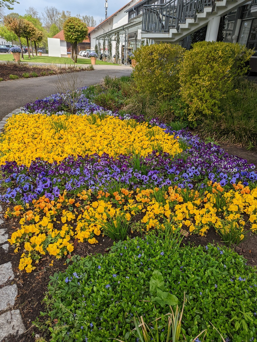 Das Stiefmütterchen-Beet ist ein farbenfroher Frühlingsgruß vor dem Clubhaus.