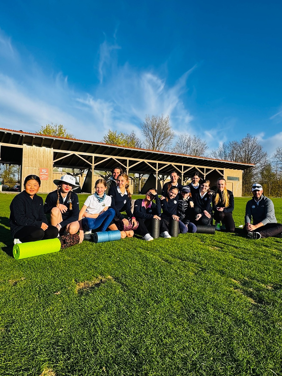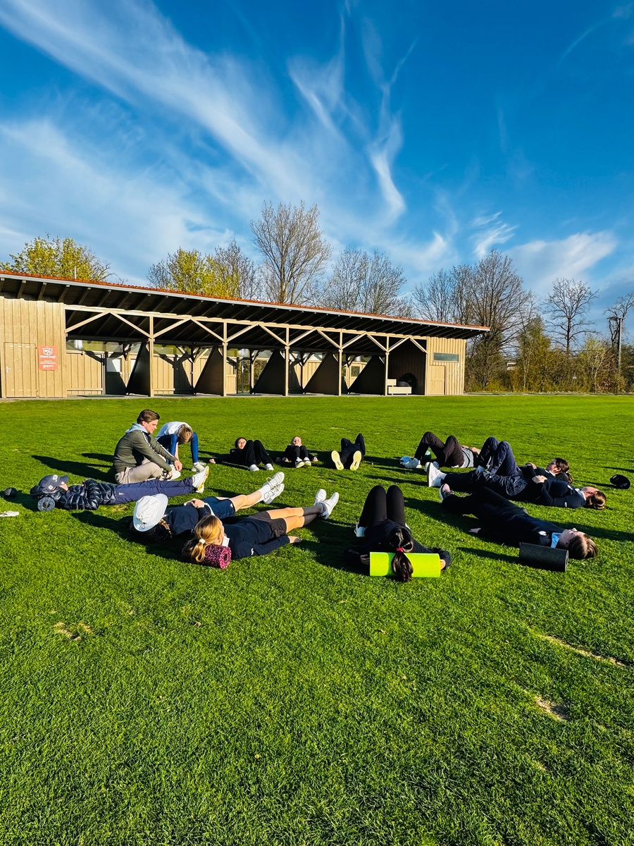 Das schöne Wetter erlaubte auch viele Bodenübungen, hier auf dem Rasen mit der Blackroll.