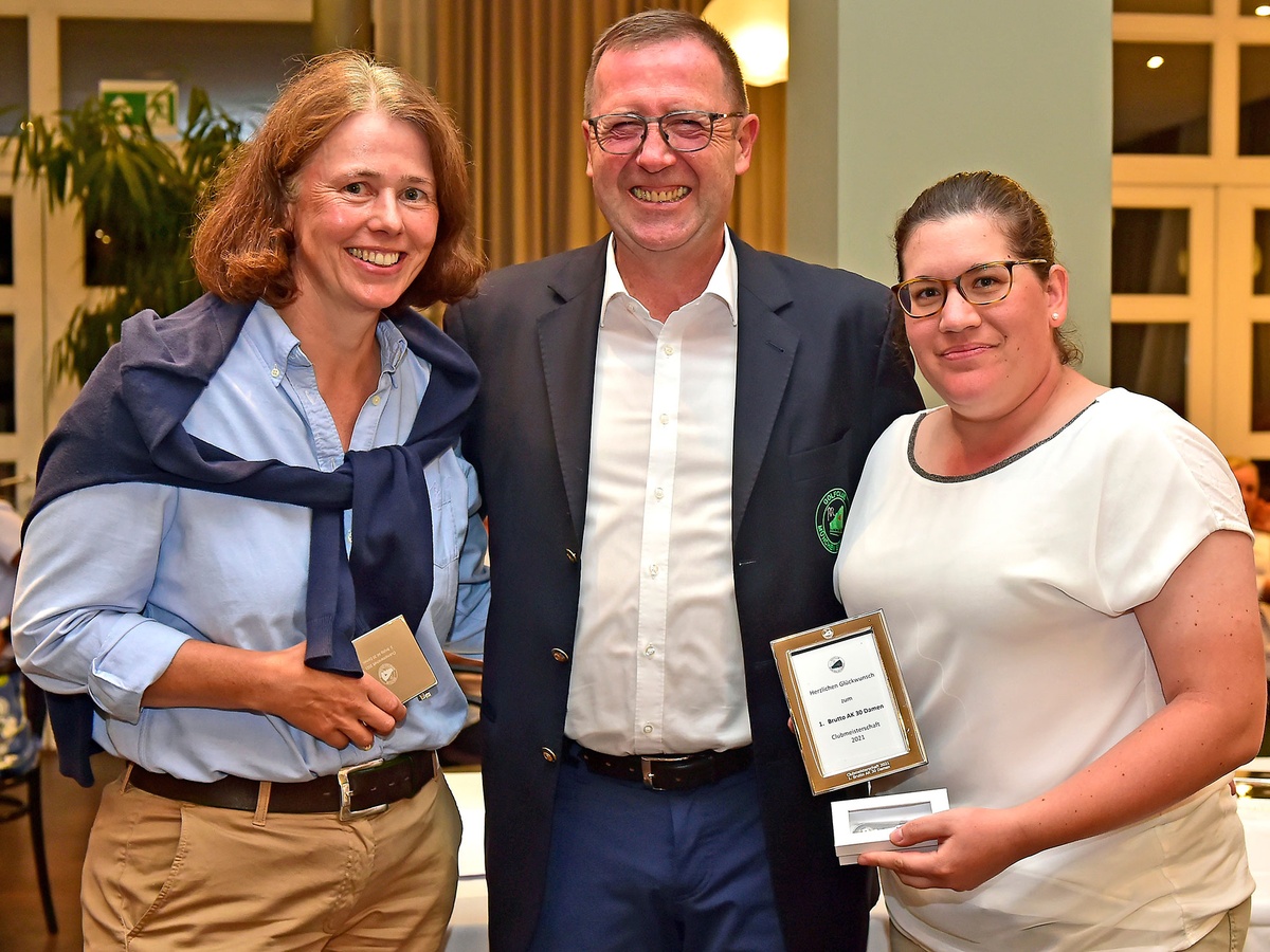 AK 30 Damen-Meisterin Marion Thalmeir, rechts, Präsident Karl-Friedrich Löschhorn, Vize-Meisterin Claudia Petersen