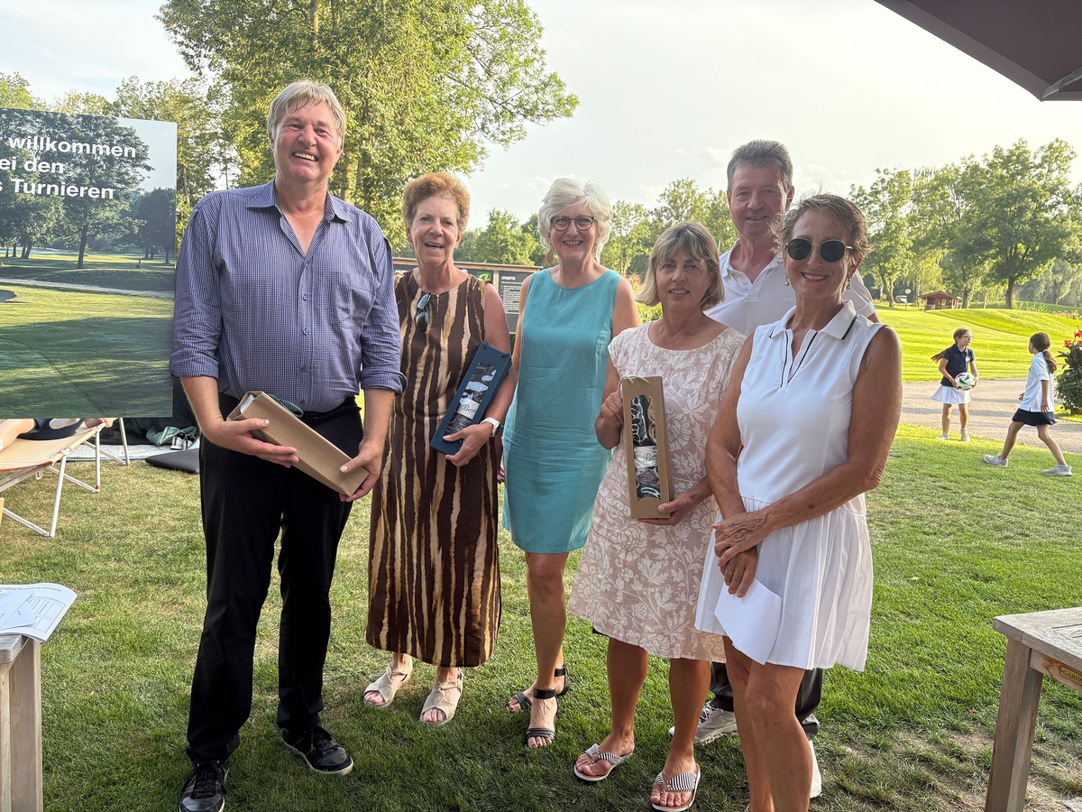 Die Nettosieger v. l. n. r. Thorsten Wintermantel (Netto A-Sieger), Marijke Manhold (2. Netto B), Mary Brunner (1. Netto B), Dr. Dr. Petra Schmid-Kirmer (2. Netto A, GC Wörthsee) und die Eichenrieder Captains Otto Hinteregger und Sophie Jäger
