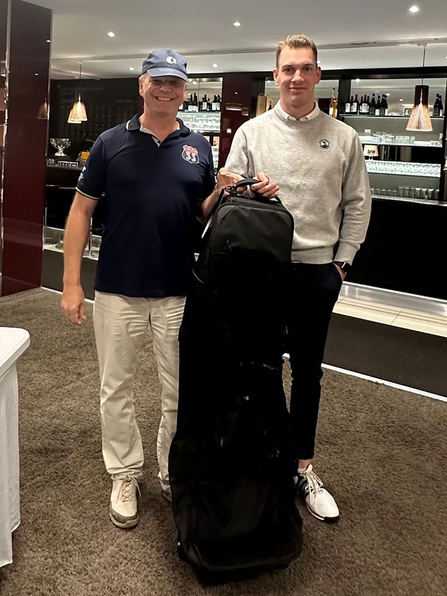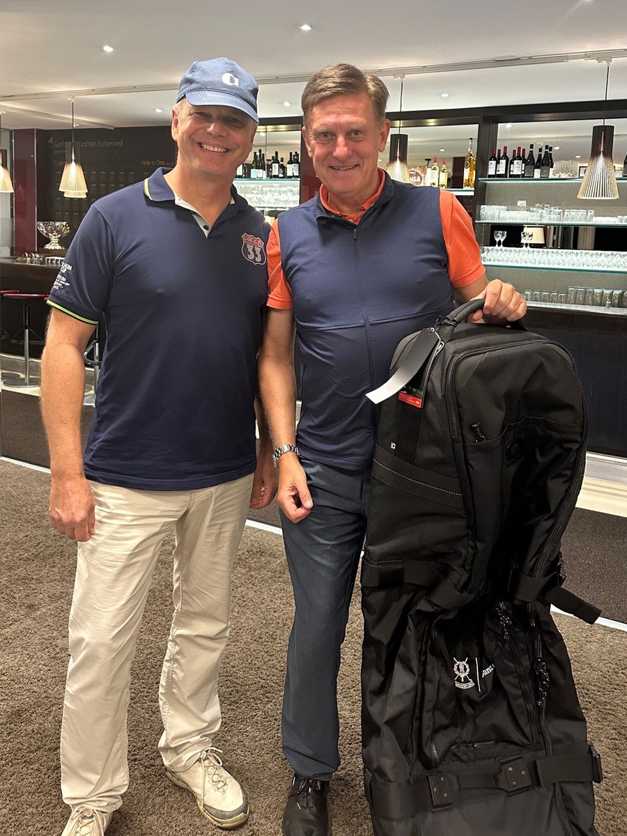 Brutto-Gesamtsieger: Egon Birnböck, rechts, freut sich über das von Marcus Ziegert überreichte Travelbag.