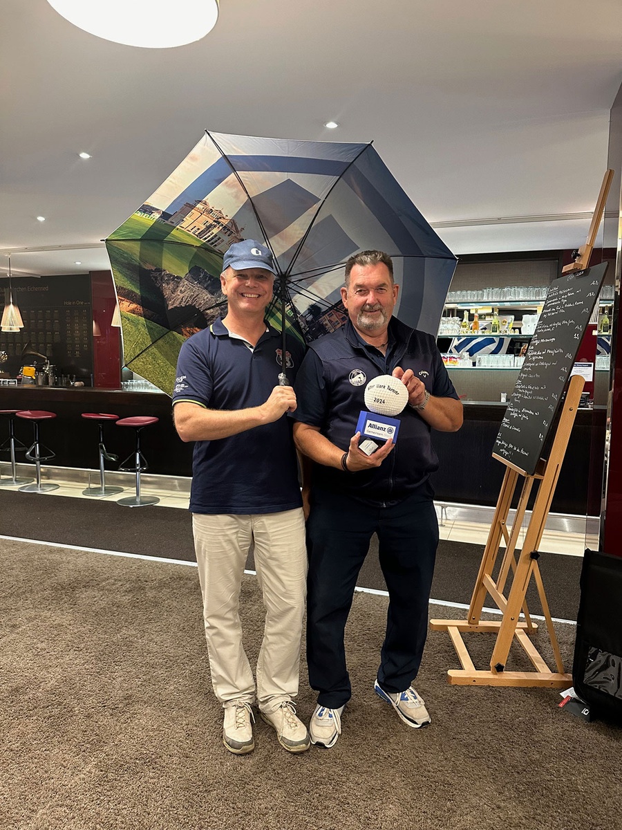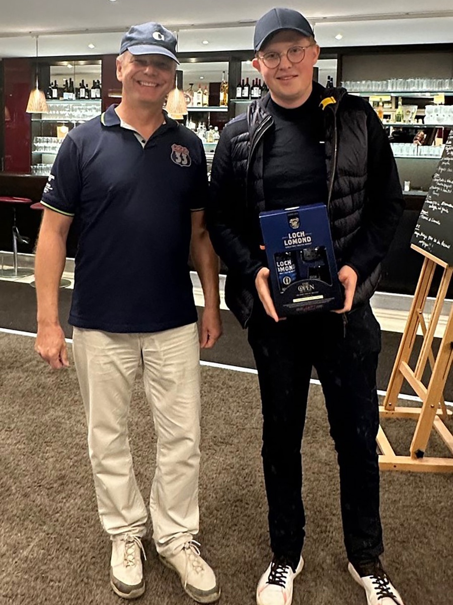 Lasse Michel bekam für den zweiten Platz im Brutto (Gesamt- und Tagesergebnis) Hochprozentiges aus Schottland von Marcus Ziegert, links.