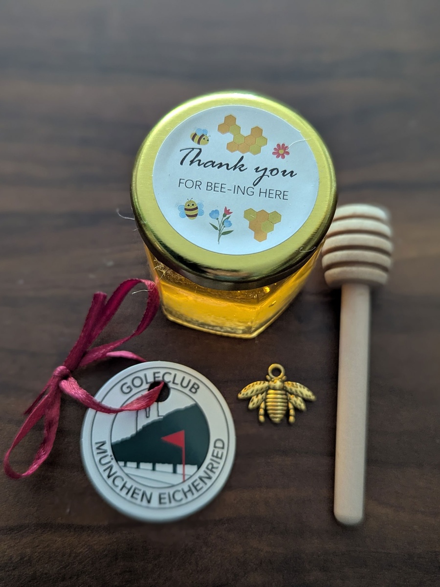 Zur Begrüßung als Geschenk: Honig-Glas „Thank you for Bee-ing here“