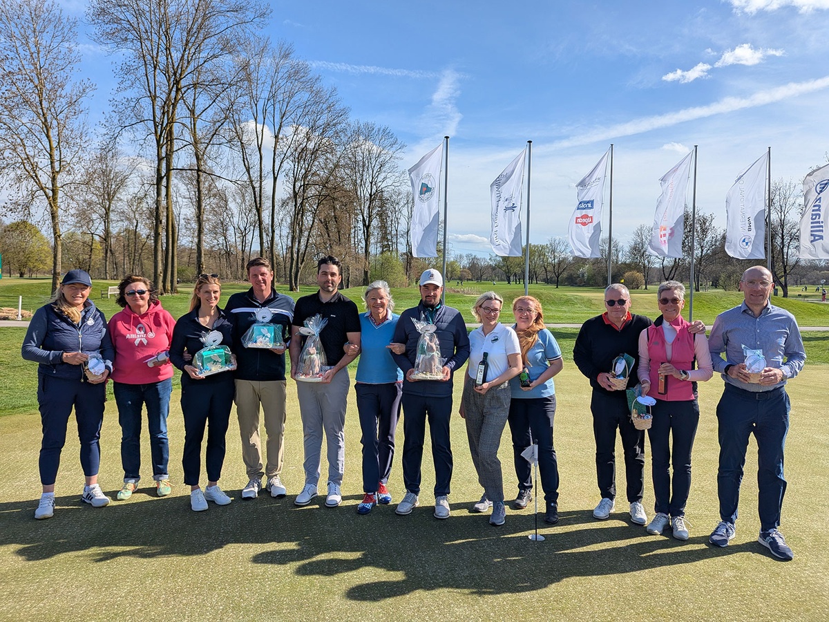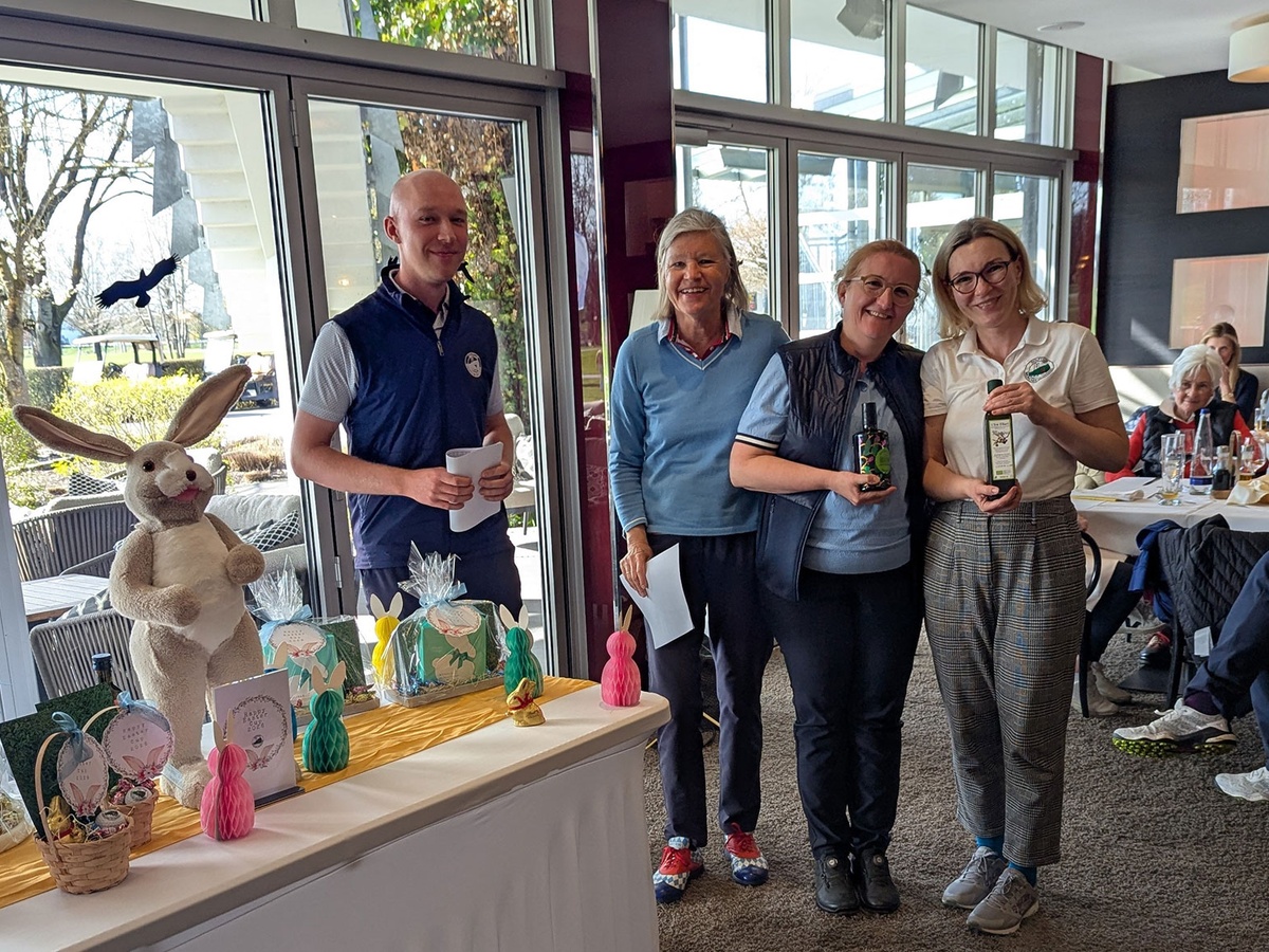 Nach 13 Jahren kindbedingter Spielpause endlich wieder Golf: Turnier-Premiere für Alla Boll, rechts. Auch Sabine Szika, neben ihr, traute sich mit Ehemann Harald ebenfalls erstmals aufs „Turnier-Parkett“. Dafür gab`s Olivenöle von Heidi Rauch. Links freut sich Mark Fischer.