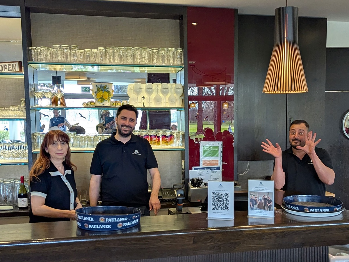 Happy, dass wir so eine tolle Gastro haben: v. l. n. r. die Wirte Caterina Domenicano und ihr Sohn Mirko mit dem stets gut gelaunten Jowi, Service.