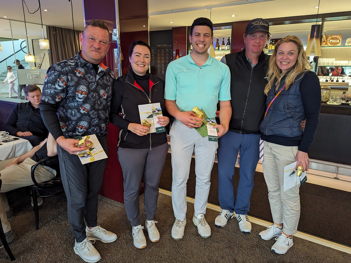 Die Netto-A-Sieger mit dem Nearest-to-the Pin-Gewinner Mirkan Deniz Günkaya in der Mitte. V. l . n. r. Alexander Bieringer, Nina Grießhammer, Dr. Tobias Kumpf, Stefanie Carola Kumpf