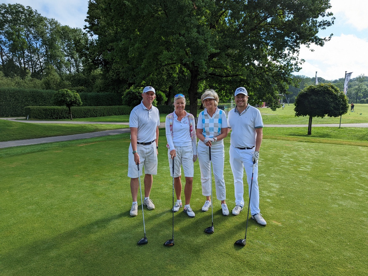 Weißer Flight mit v. l. n. r. Robert Reiser, Mitglied Nr. 41, PR-Frau Heidi Rauch, Mary Brunner, deren Mann Heribert den Nearest-to-the-Pin gewann, und dem Drittplatzierten der Netto-Klasse C, Lennart Hinrichs.