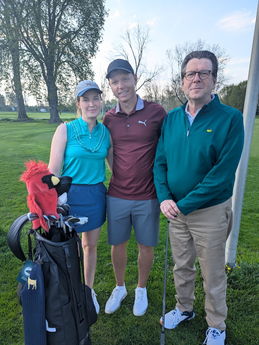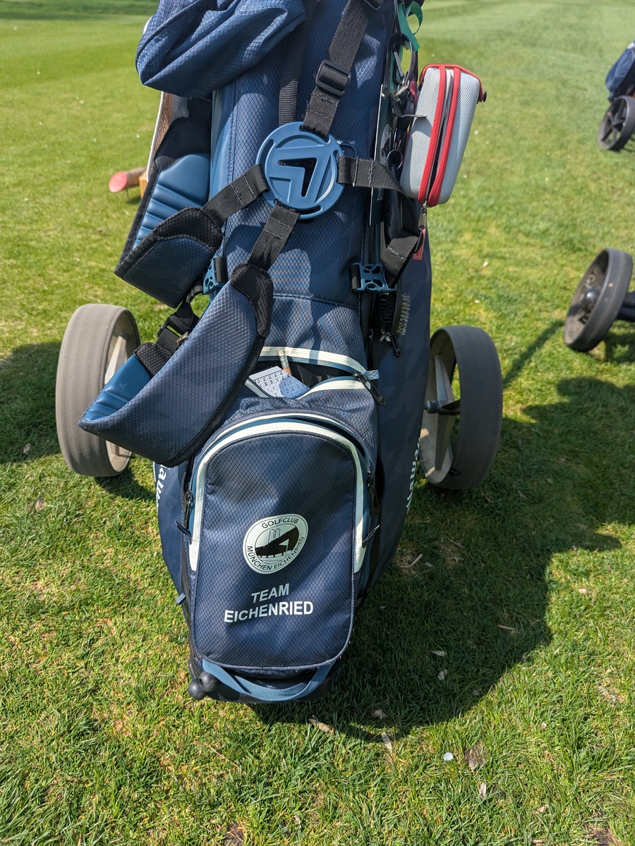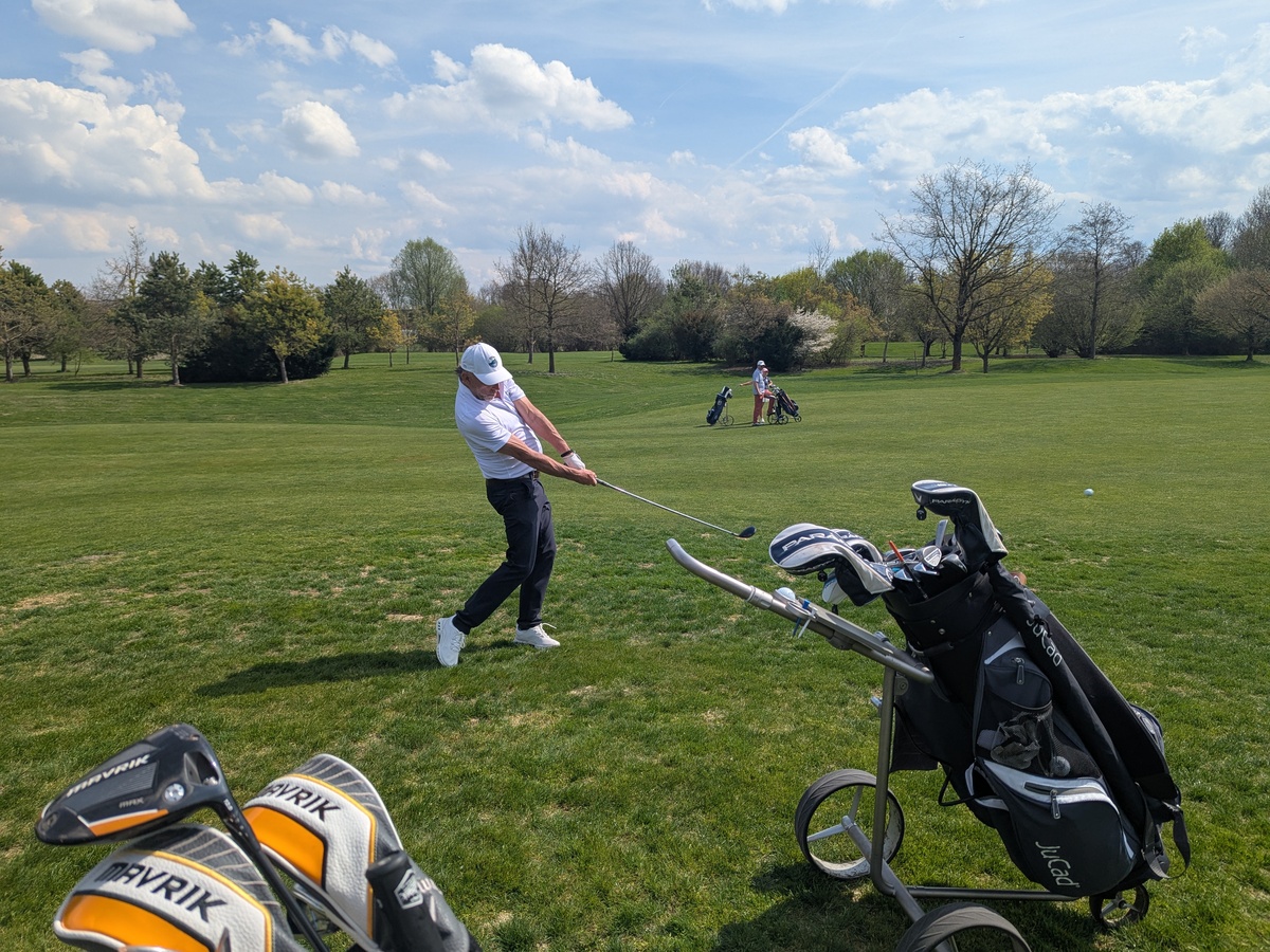 Auch Profis üben gern in Eichenried! Am 18. April nach einer Familienrunde gesichtet: Matti Schmid mit seiner Freundin Nora und seinen Eltern (nicht auf dem Foto), herzlich begrüßt vom langjährigen Freund Ingolf Jensch, rechts.