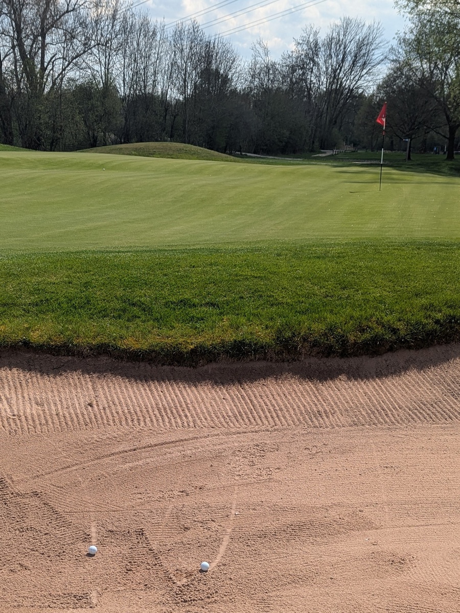 So sollte es eigentlich nicht sein: beide Bälle parallel im Bunker! Besser wäre einer auf dem Grün gewesen….