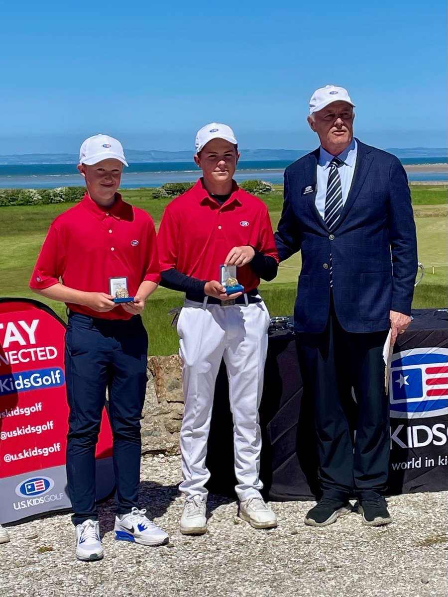 Henry, Mitte, mit seinem Team-Partner Alfie Turner, UK, und US Kids Golf-Gründer Dan Van Horn.