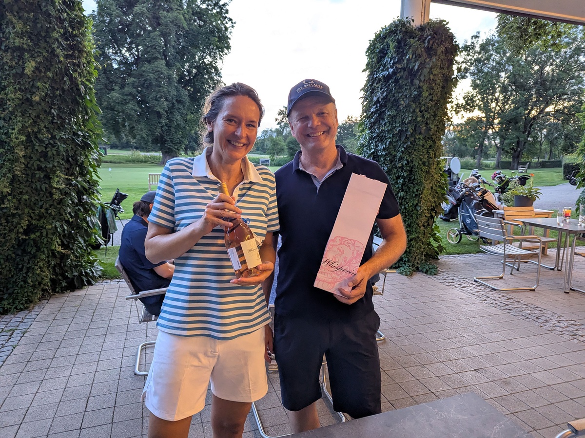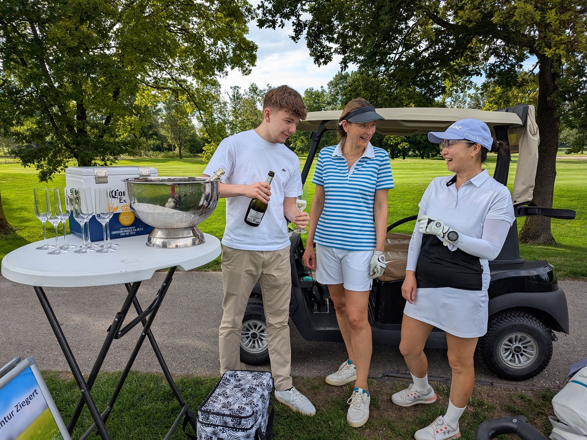 Schüler-Praktikant Viktor schenkte an der C 1 Xiaomei Wang und Laura Schütte „Ziel-Prosecco“ für den Nearest-to-the-Pin ein. Hat funktioniert!