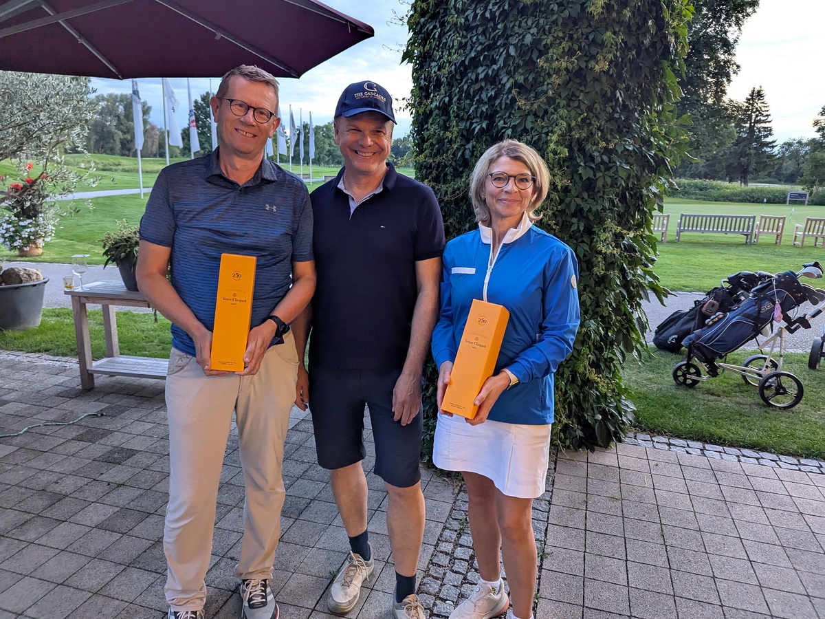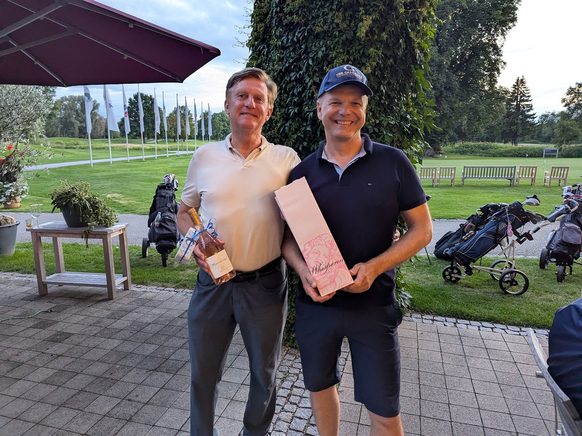 Bei den Herren schlug Egon Birnböck den Ball am nähesten an den Stock. Er freute sich über den Rosé-Preis von Marcus Ziegert, rechts.