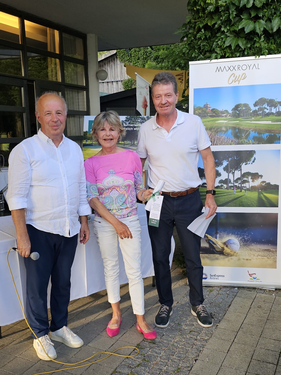 Brutto-Siegerin Ute Häring, die den Longest Drive Damen mit 148 Metern gewann, daneben Otto Hinteregger, der den Longest Drive Herren mit 172 Metern für sich entschied, und Sponsor Eugen Menares, links.