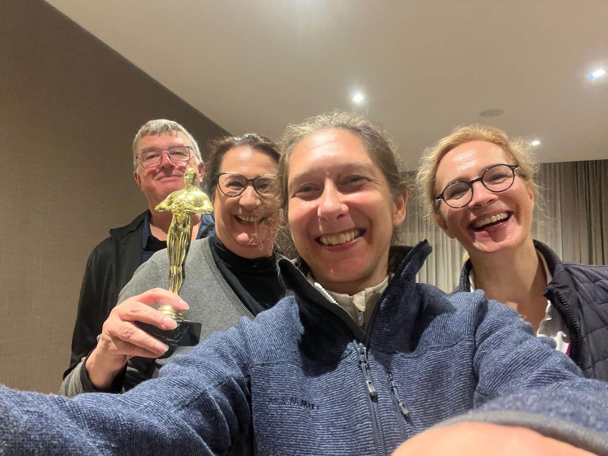 Freude bei Siegerin Claudia Sonnenberg, der Zweiten Kristin Rolle, dem Drittplatzierten Lukas Reitz und, hinten links, Marshal Thomas Michelis.