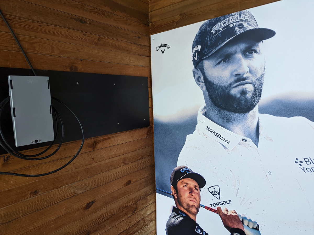 Jon Rahm und viele andere Top-Spieler, die Callaway unter Vertrag hat, zieren die Rückwände der Abschlagboxen. Daneben zu erkennen: die Installation für den Toptracer-Monitor.