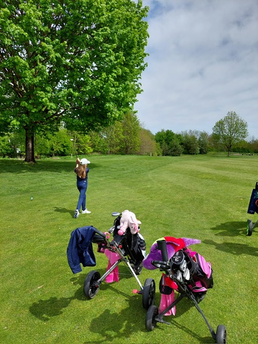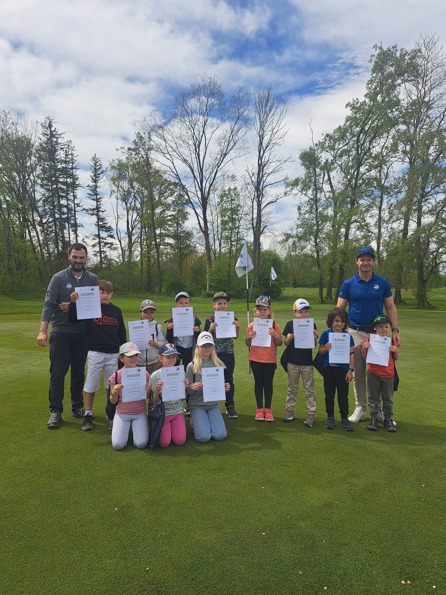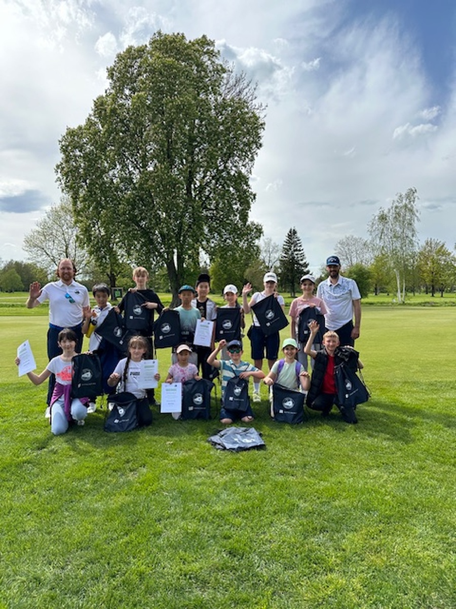 Golfakademie-Leiter Hans-Christian Buchfelner, links, und Pro Pascal Gabsa, rechts, haben den jungen Probe-Golferinnen und -Golfern den Spaß am Golfen vermittelt.