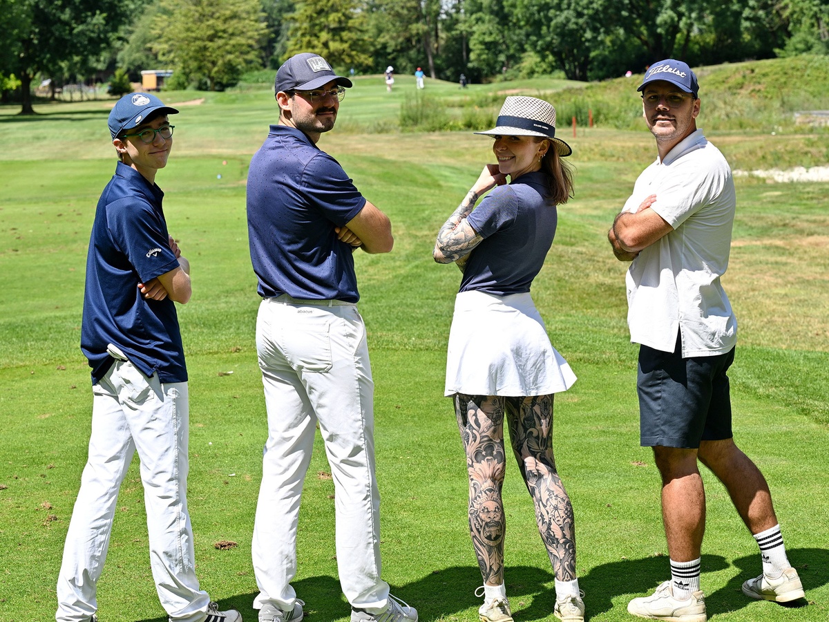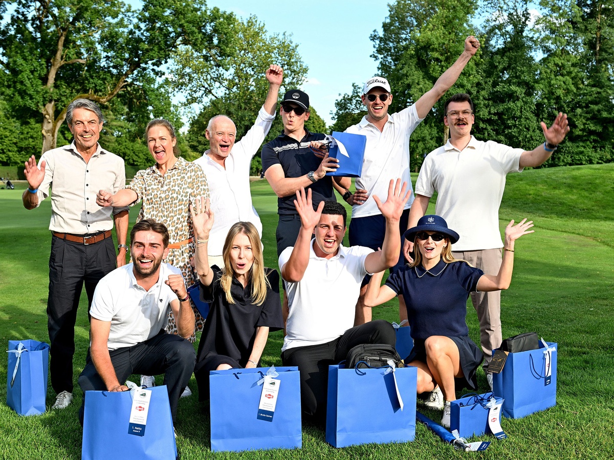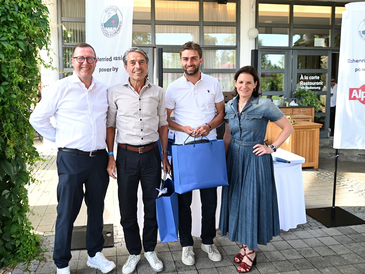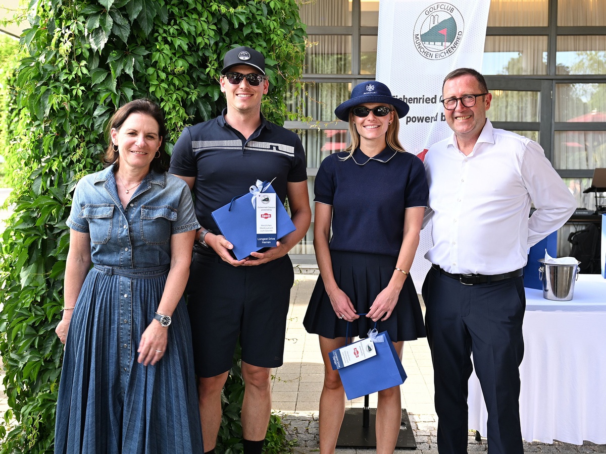 Longest Drive-Gewinner Denis Gabriel und Mehrfach-Gewinnerin Lisa Sophie Walter, umrahmt von Vera Vaubel und Karl-Friedrich Löschhorn