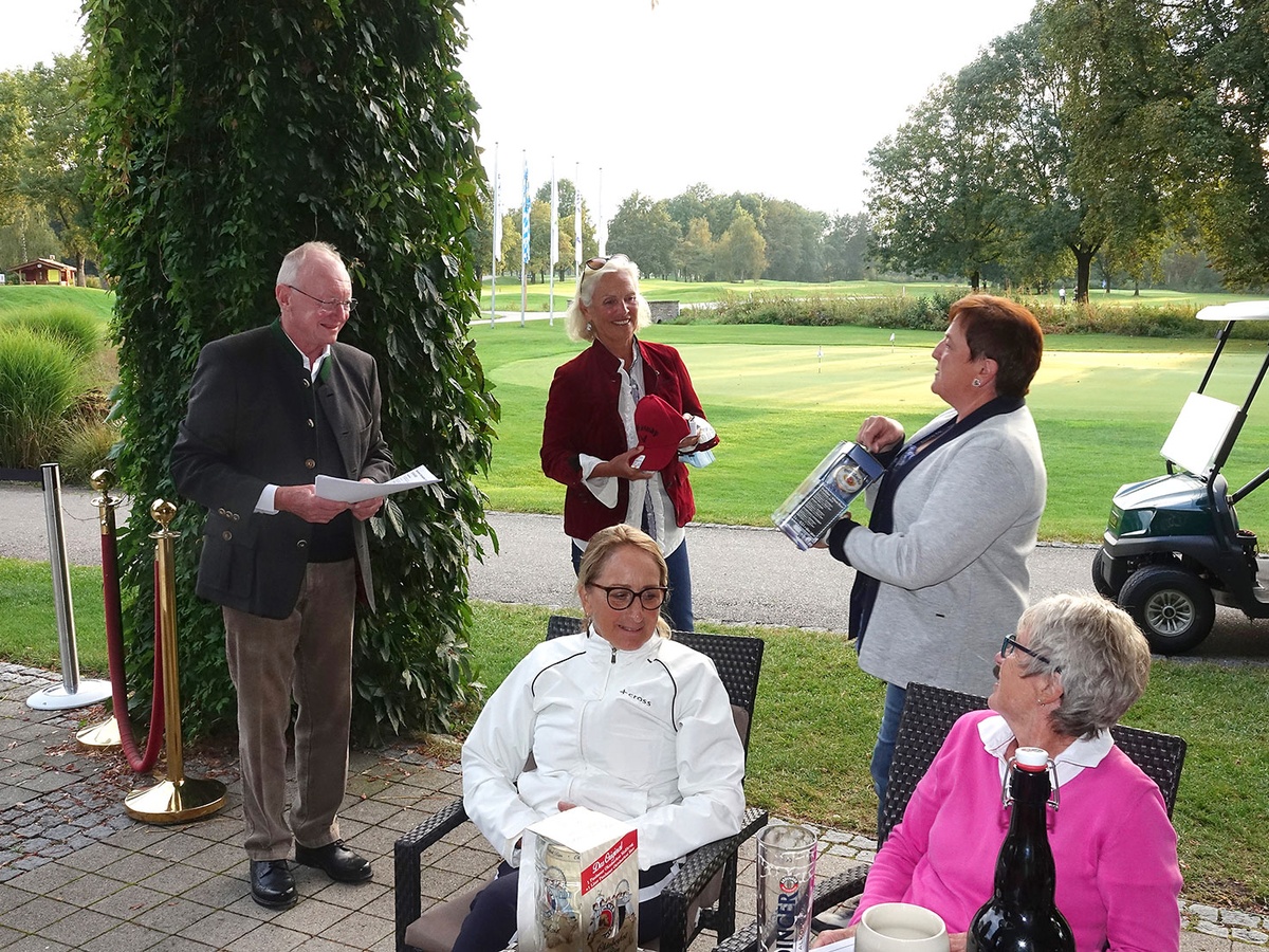 Erdings Senioren-Captain Petra Gerstner, rechts, bedankte sich mit Grünbacher Wiesn-Bier bei Barbara Laistner und Andi Diermeier.
